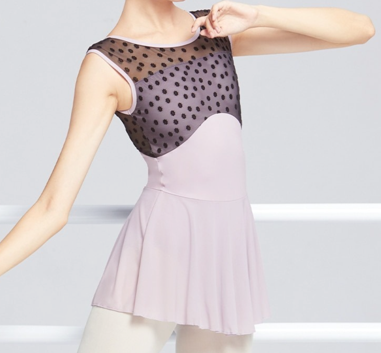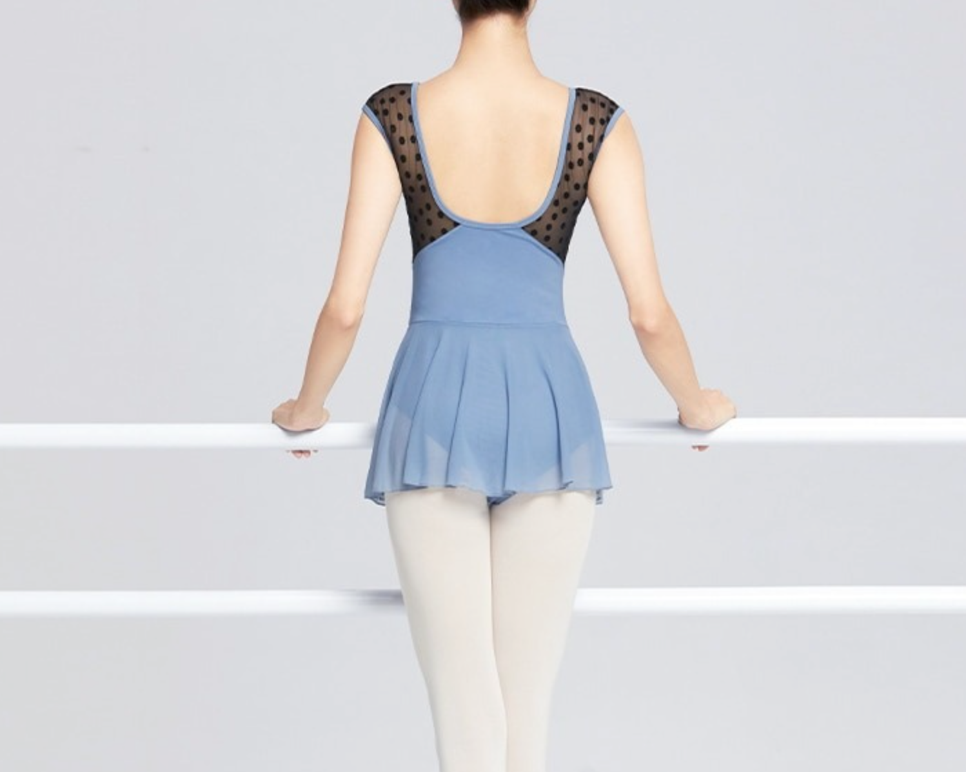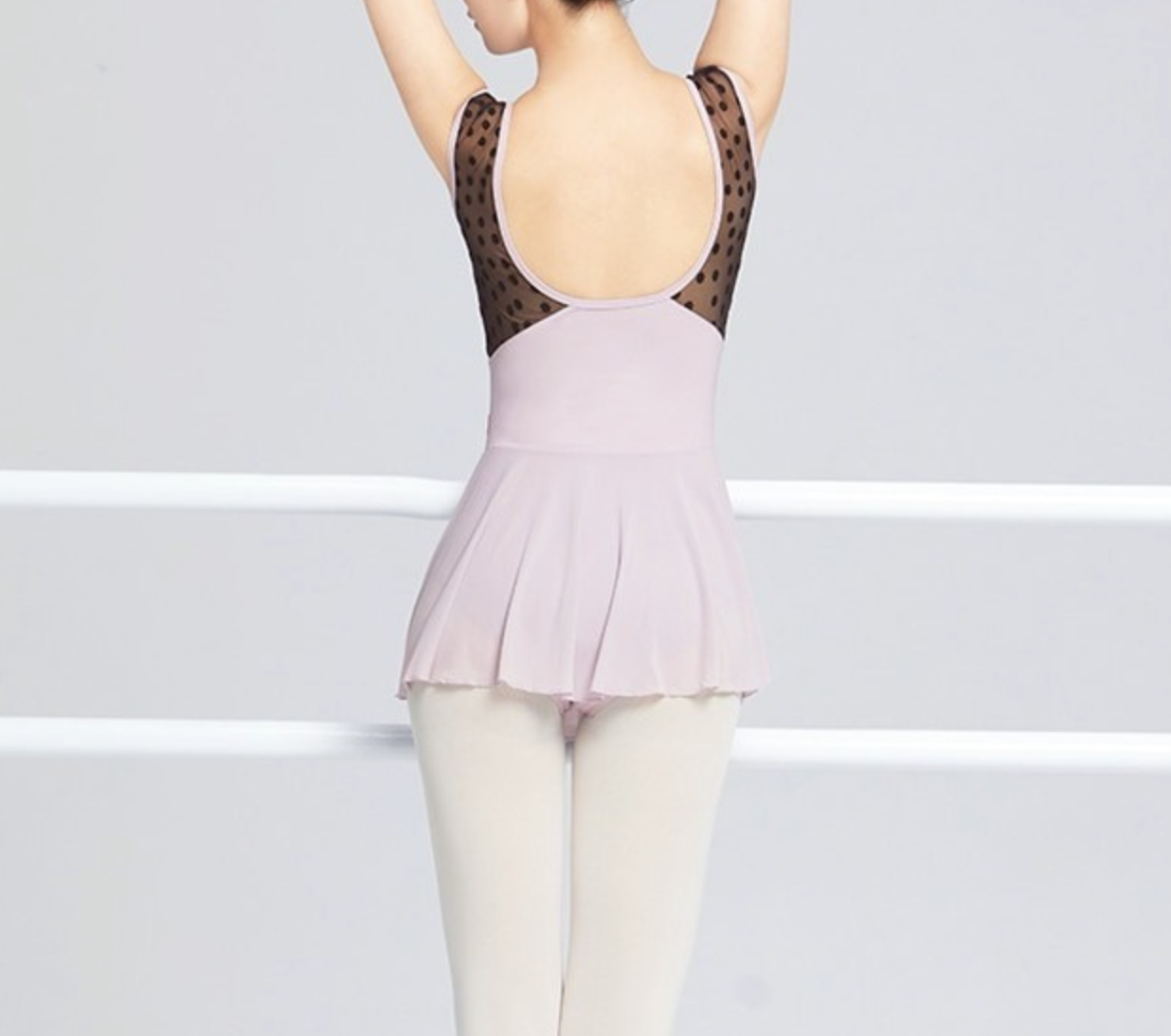 Elegant ballet dress featuring a U-back design, soft flocked mesh splice, and built-in chest pads. Lightweight, stretchy, and perfect for ballet, gymnastics, or stage performances.