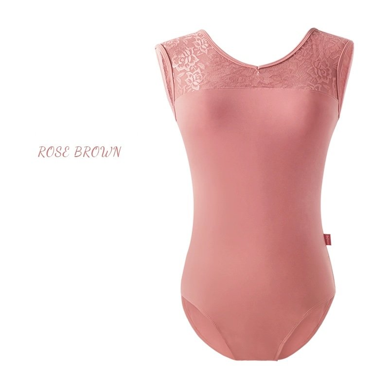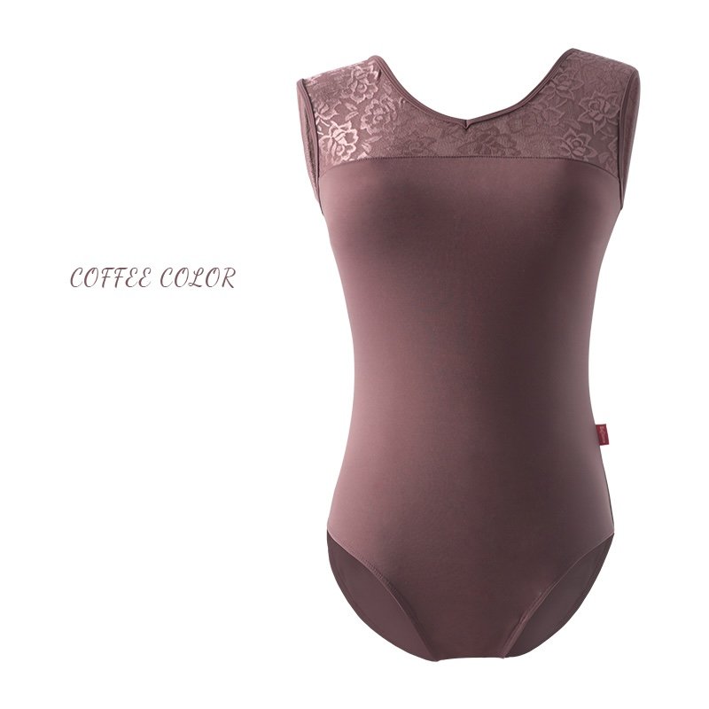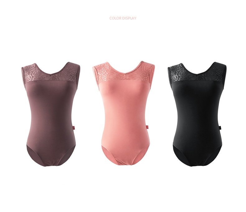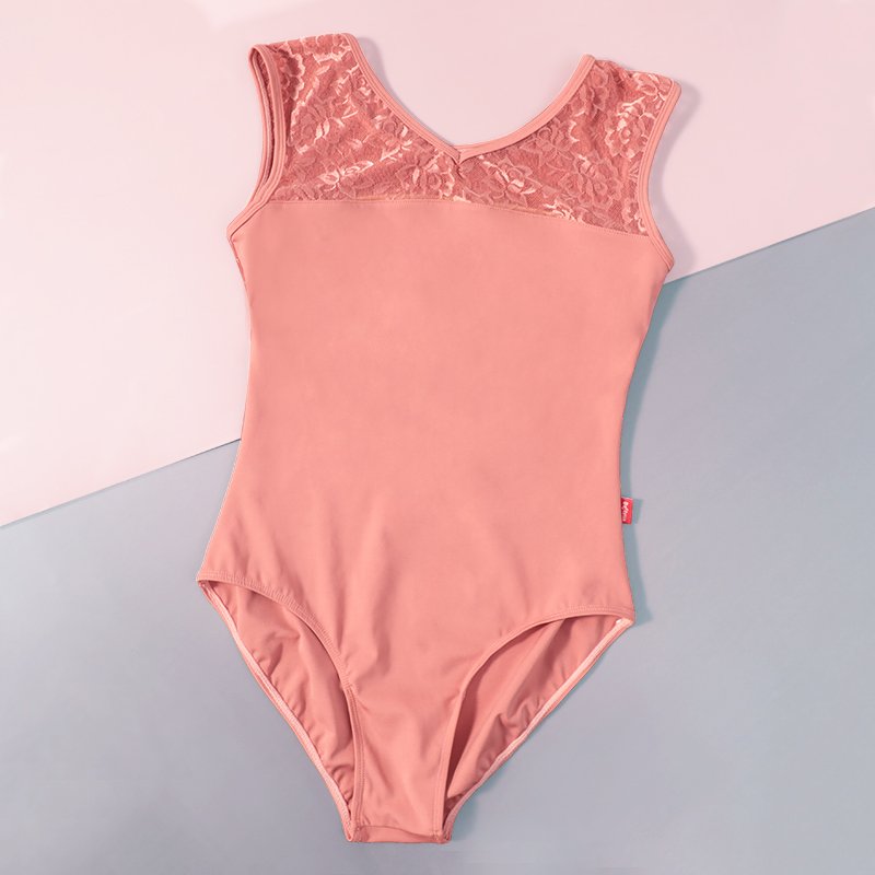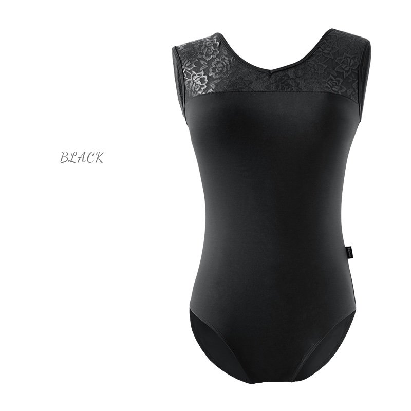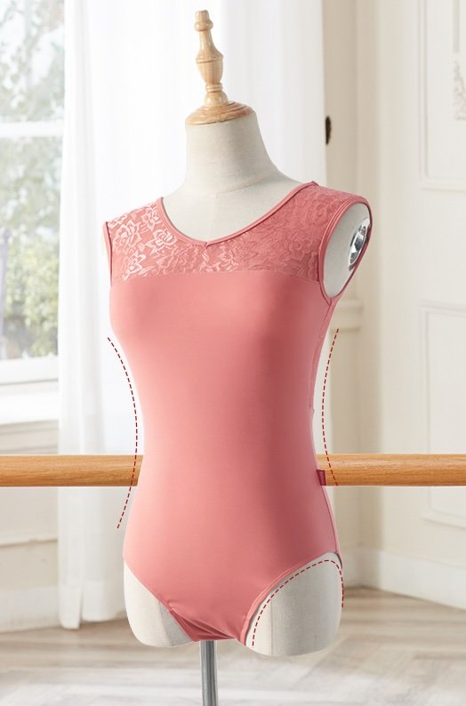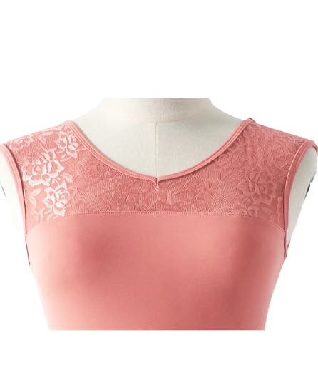 Elegant tank-style leotard with lace detailing on the shoulders and back. Features front lining with built-in chest pads. Soft, stretchable, and perfect for ballet, gymnastics, aerial yoga, or even as swimwear.